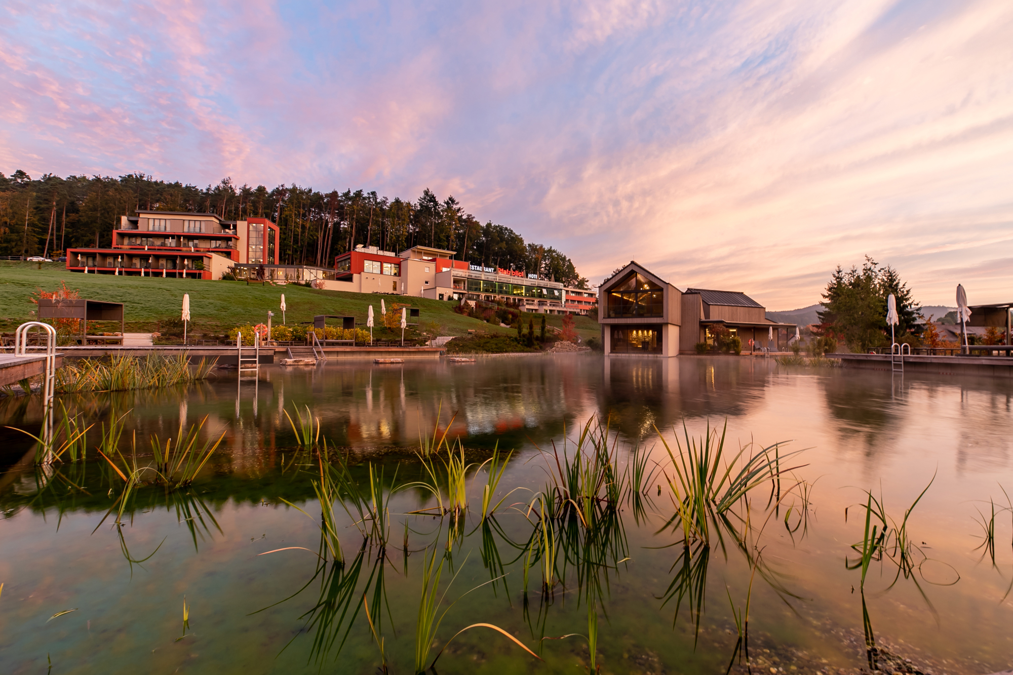 Im textilfreien Saunabereich der Vitalwelt sprudelt ein 35 Grad warmer Panorama-Whirlpool, der insbesondere in den Abendstunden zum Lieblingsplatz wird. Im Sommer lockt der 38 Meter lange Naturbadeteich „Kleiner Wasgausee“ mit glasklarem Wasser – komplett natürlich gefiltert, ohne Chemie.